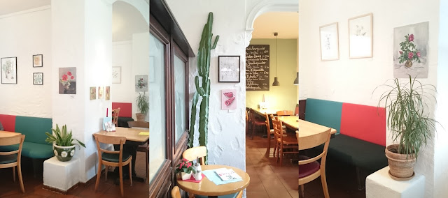 You can visit the cosy Café close to the Frankfurter Cathedral, have a nice brunch, meal or coffee pot, and look at the pictures that hang at the walls. There are 21 original watercolors and oil paintings of flowers and veggies, and 4 Prints of my more modern botanical series "Foliage".
